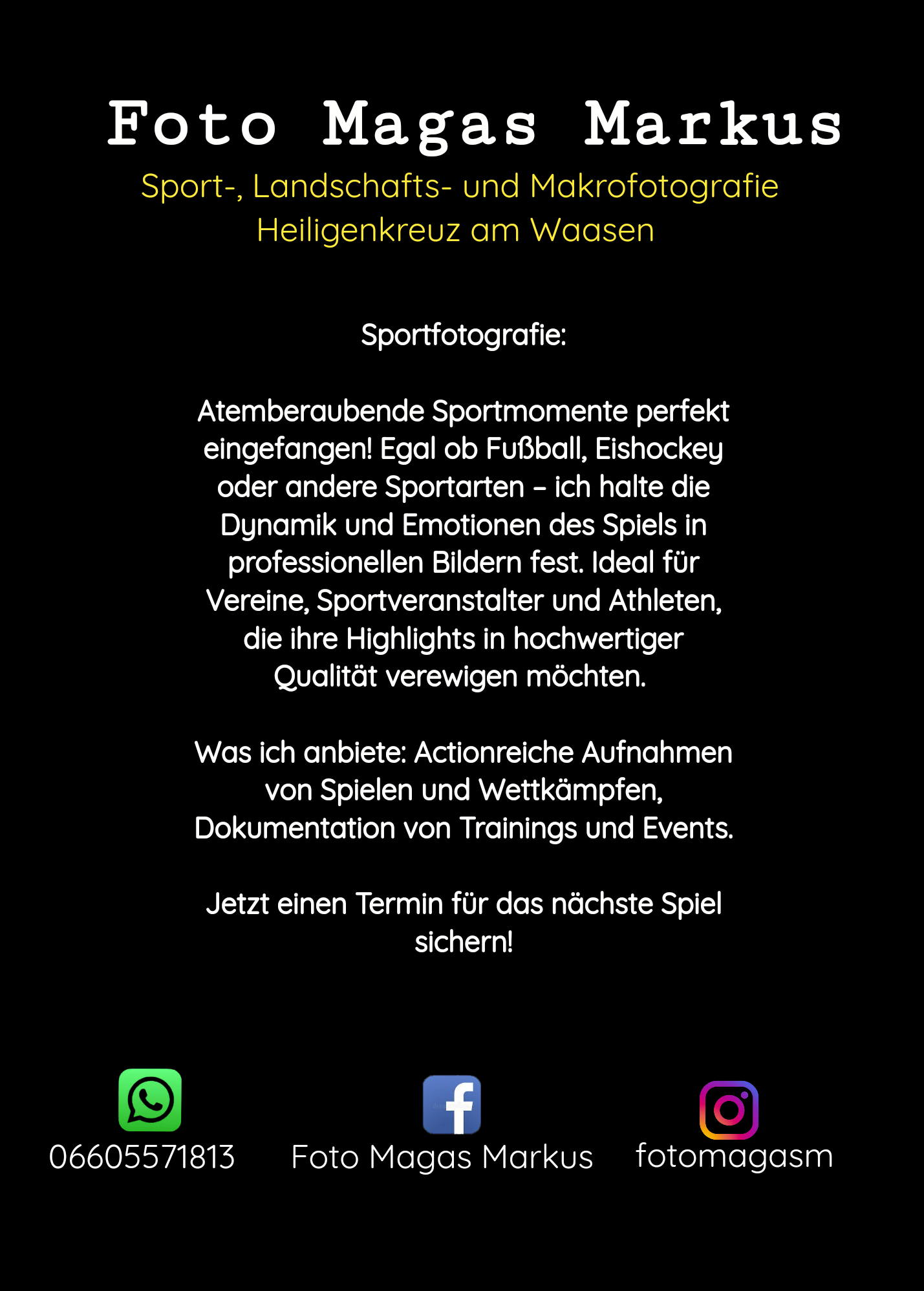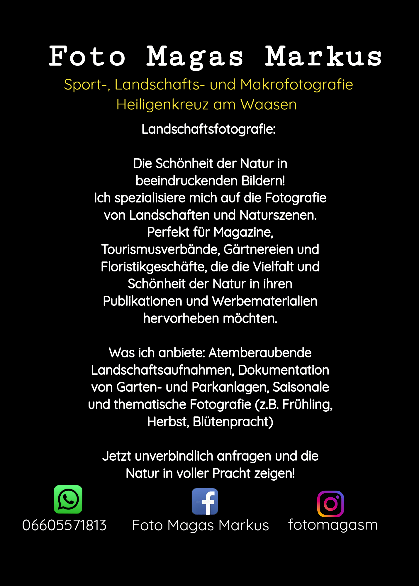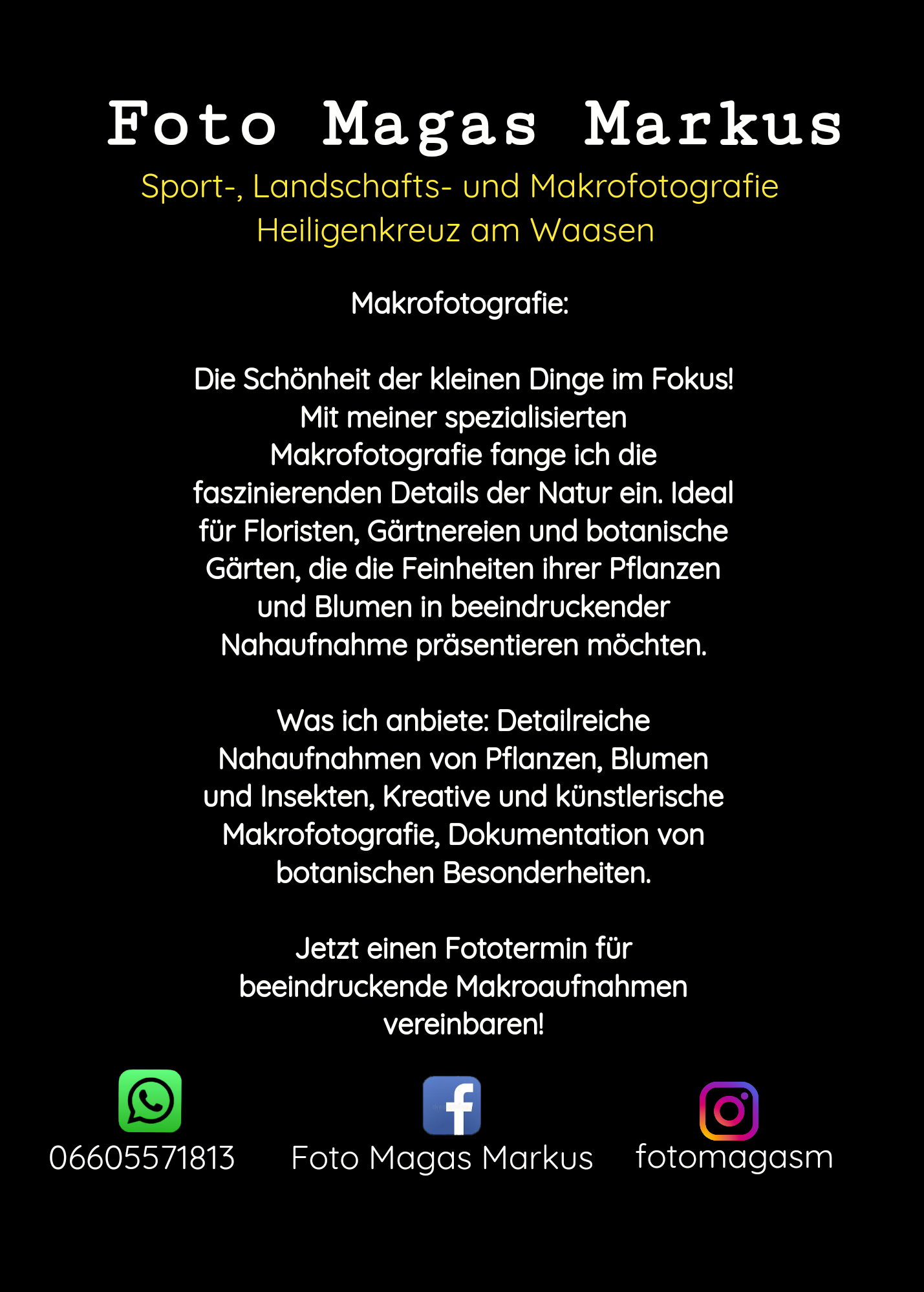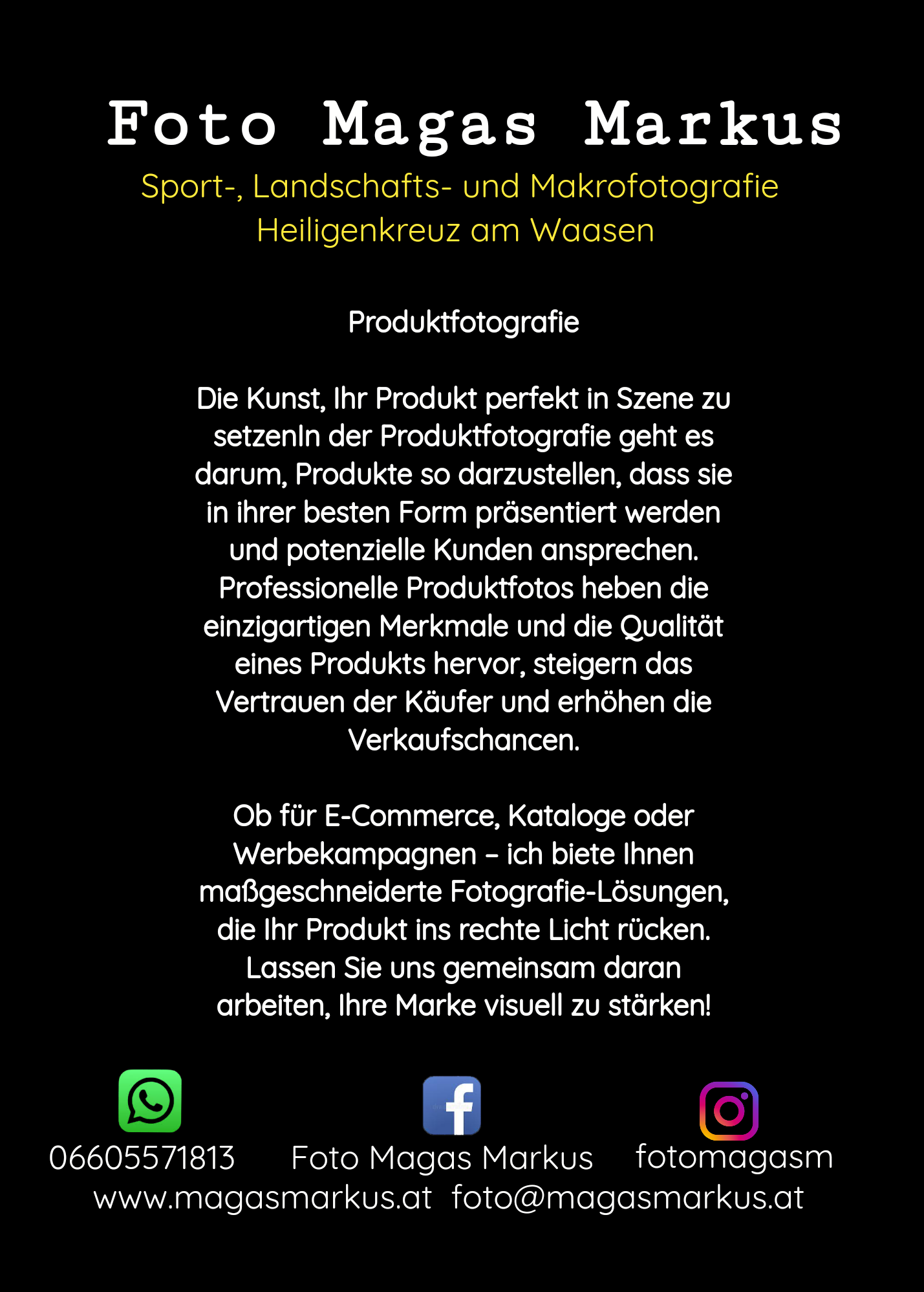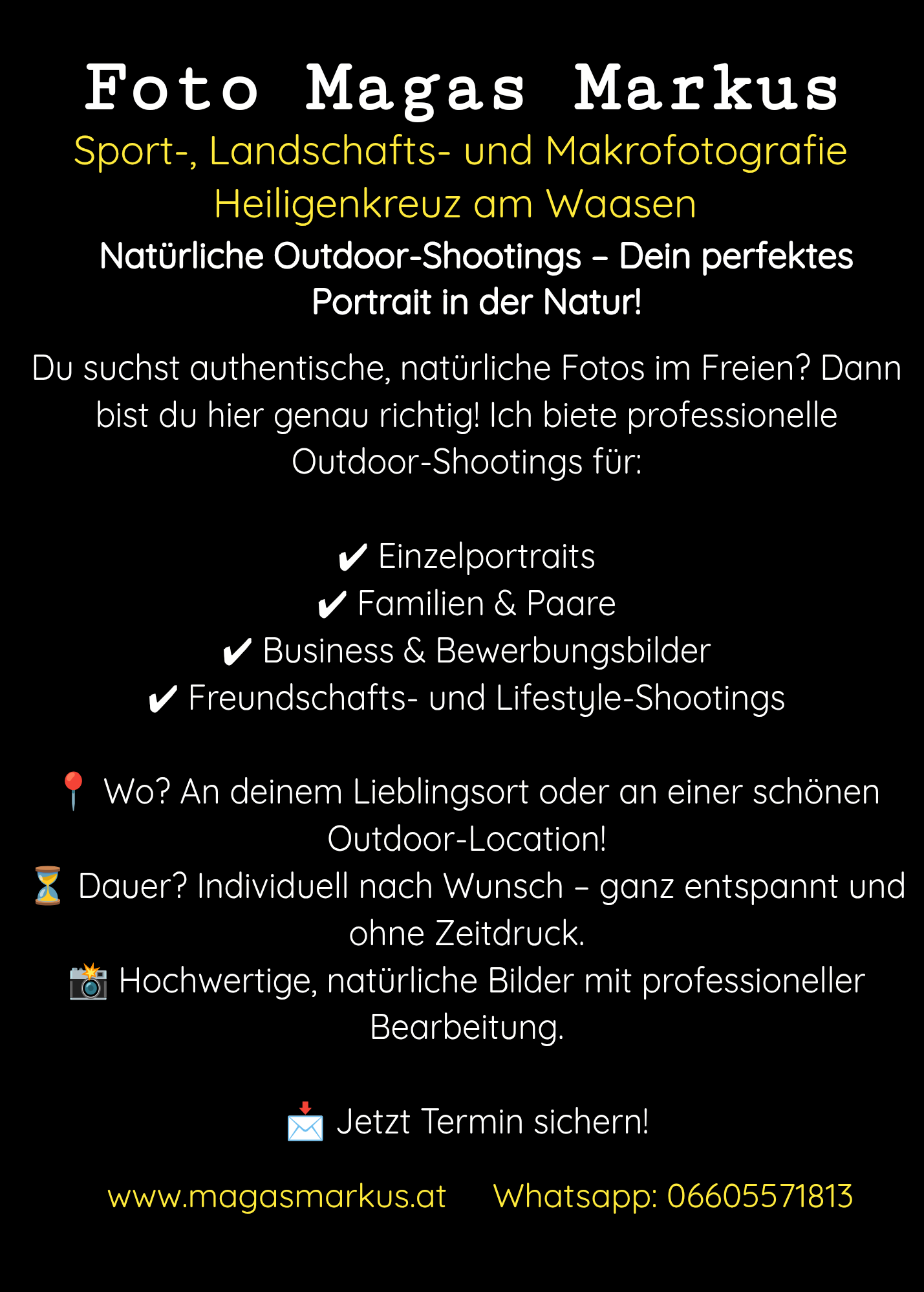 Foto Magas Markus ist Ihr nebenberuflicher Fotograf in Heiligenkreuz am Waasen, spezialisiert auf Sport, Landschaft, Makro, Produkt und Outdoorfotografie. Mit einem geschulten Auge für den perfekten Moment und modernster Ausrüstung setze ich Ihre besonderen Augenblicke in außergewöhnliche Bilder um. Meine Leidenschaft für Fotografie und mein Streben nach Perfektion spiegeln sich in jedem meiner Werke wider. Ob dynamische Sportevents, beeindruckende Naturlandschaften, faszinierende Nahaufnahmen oder verkaufsfördernde Produktaufnahmen – ich biete Ihnen einzigartige Fotografien, die Emotionen und Geschichten einfangen. Vertrauen Sie mir, um Ihre unvergesslichen Momente in atemberaubende Bilder zu verwandeln.